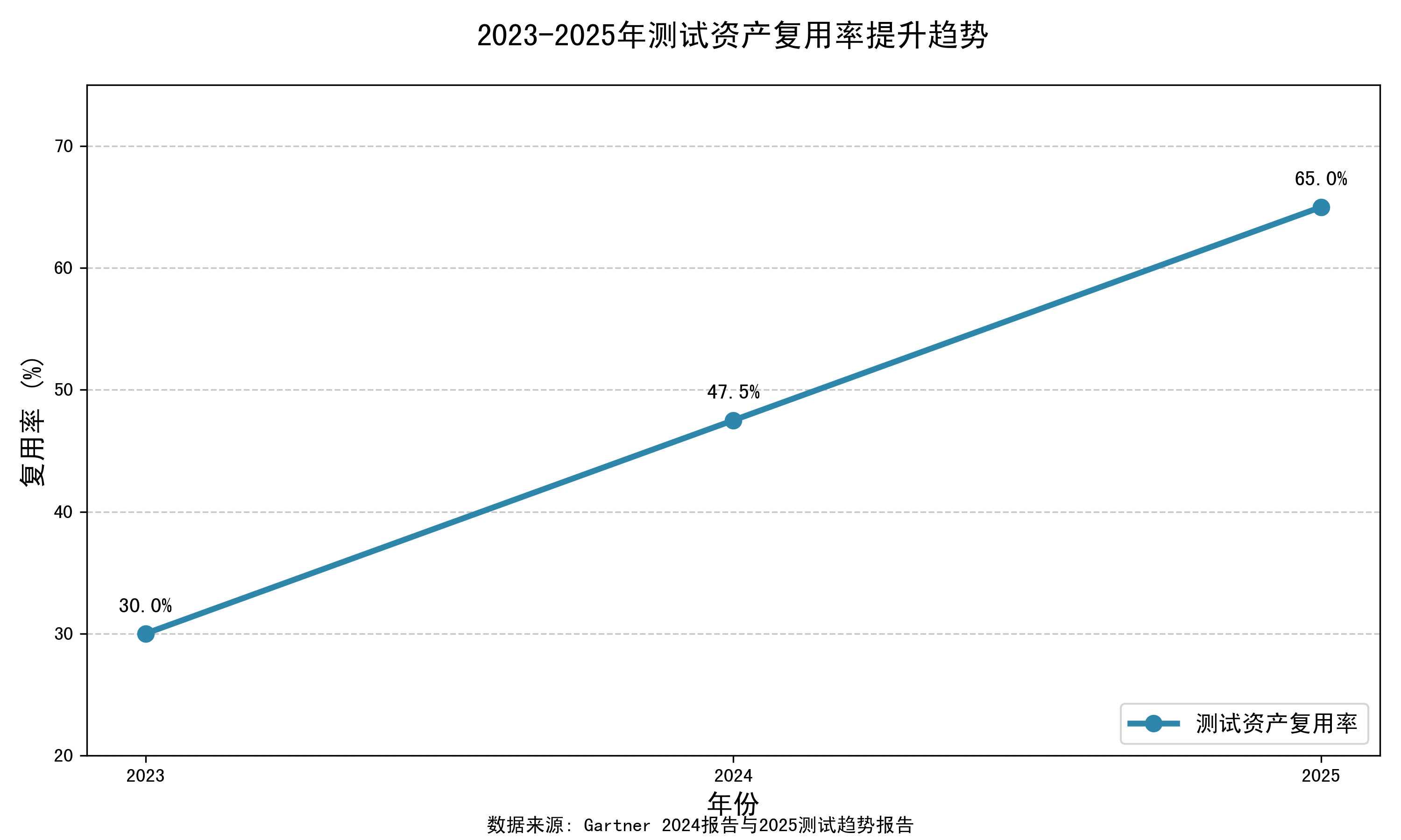 - 2025年:头部企业达65%+,复用率成为测试成熟度模型(TMMi)关键指标。