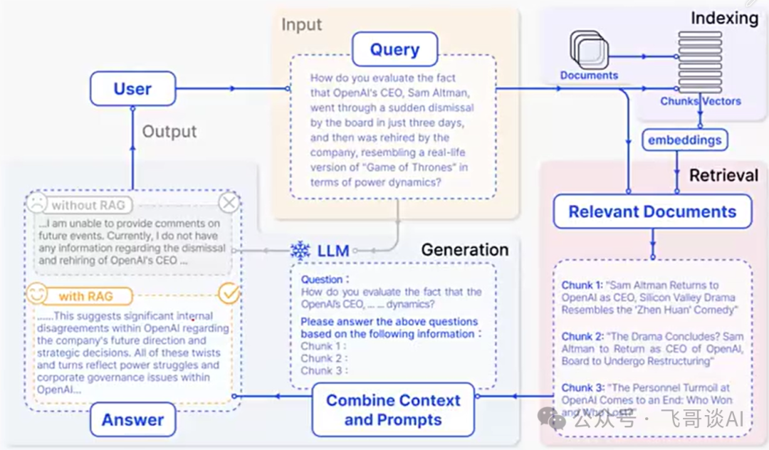 当用户提问时,RAG 会先帮模型 “搜资料”,找到最相关的知识片段。这一步就像咱们查字典:先根据问题找关键词,再翻到对应的页码。