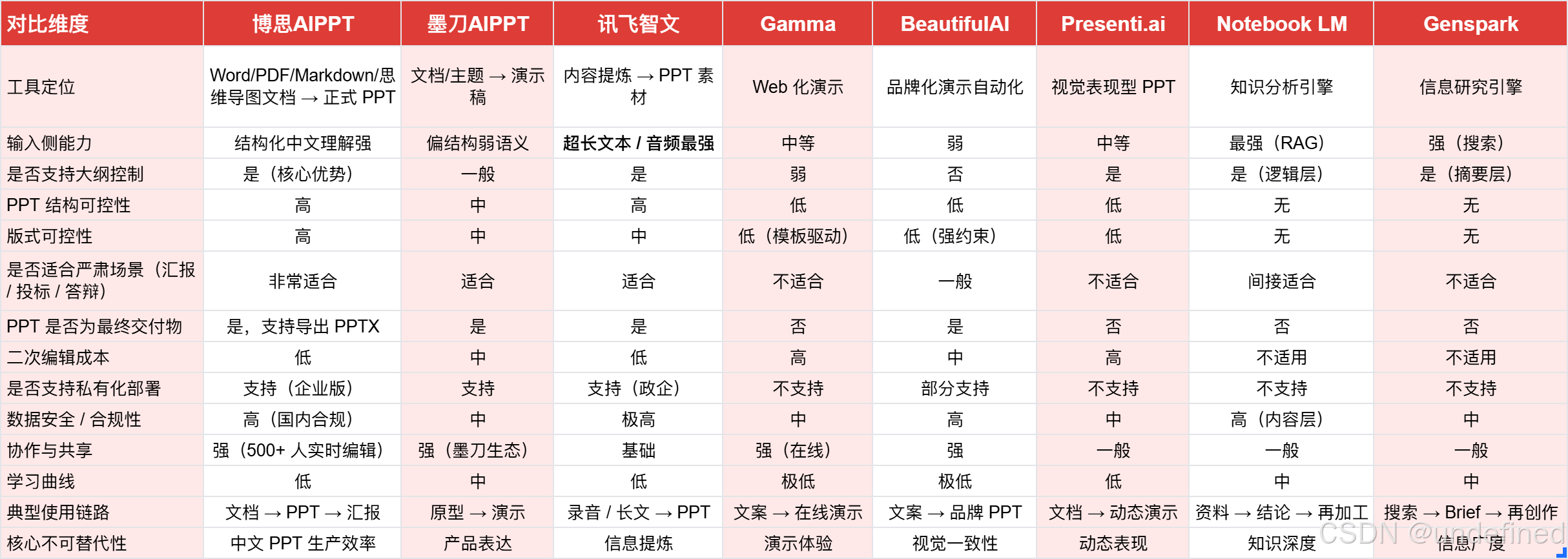 解法:在使用博思AIPPT或Gamma时,尽量在 Prompt 中明确标注“如果文档中没有数据,请使用占位符,不要编造数据”。或者使用 Notebook LM 先提取准确数据,再进行生成。