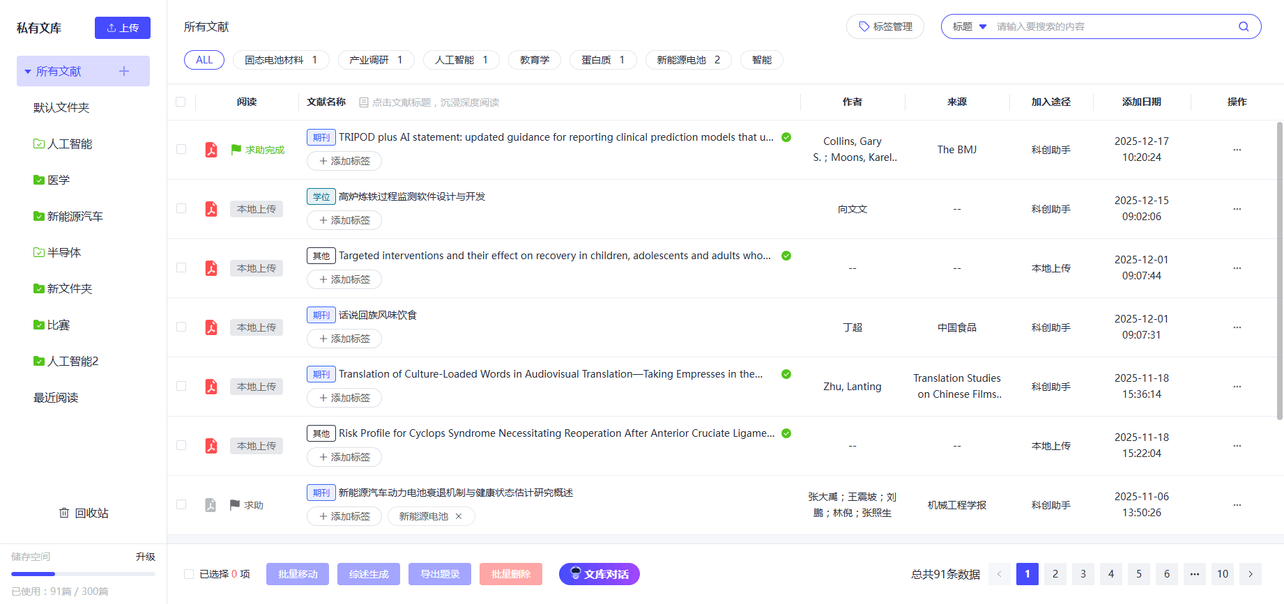 文库管理:云端同步个人私有知识库,支持AI自动分类与标签体系管理。文件无序→有序,利用AI技术自动识别和分类文献,支持按主题、作者、年份等多维度分类,用户可自定义标签体系。