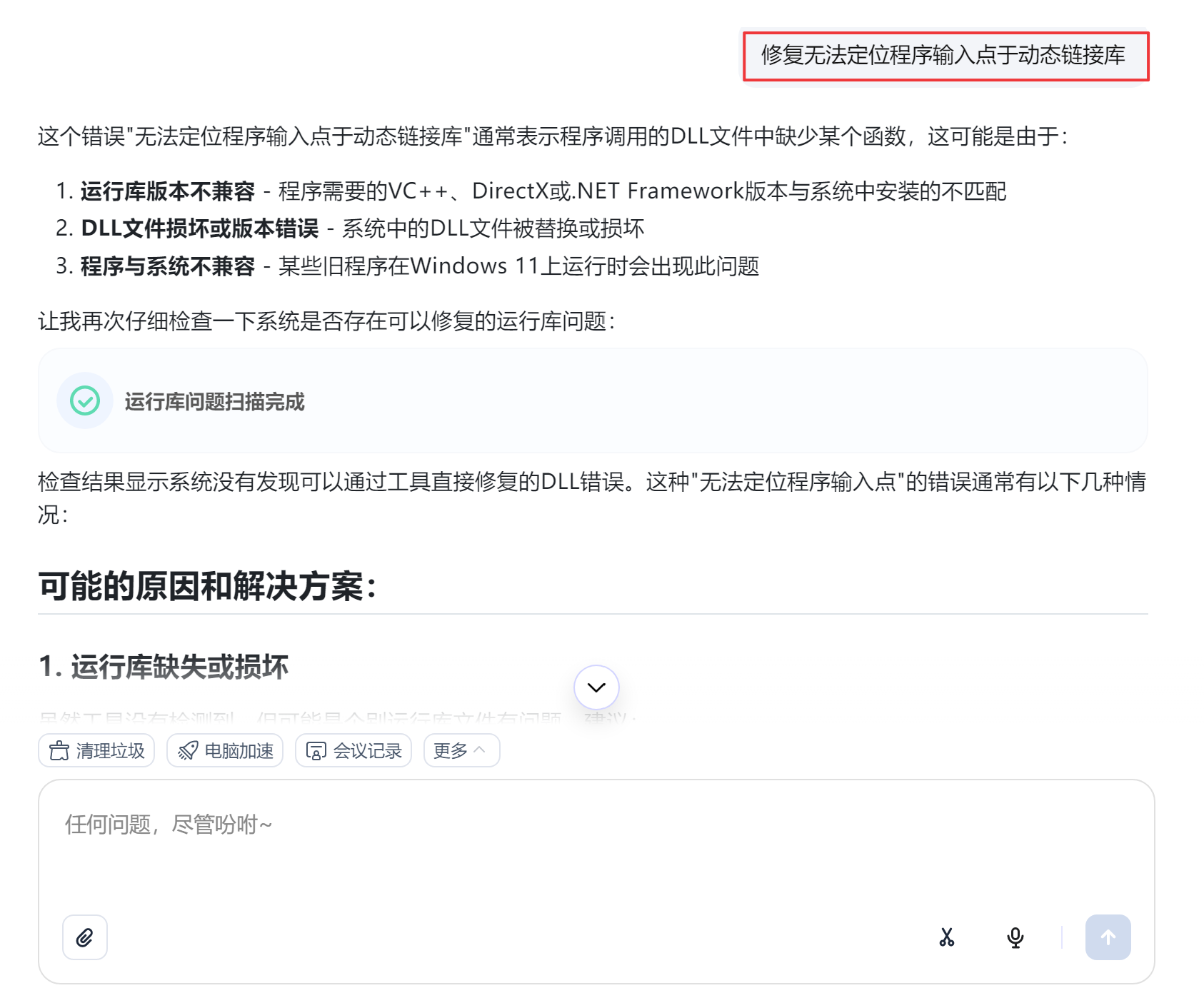 - 打开元气AI助手,在对话框中输入:"修复无法定位程序输入点于动态链接库"