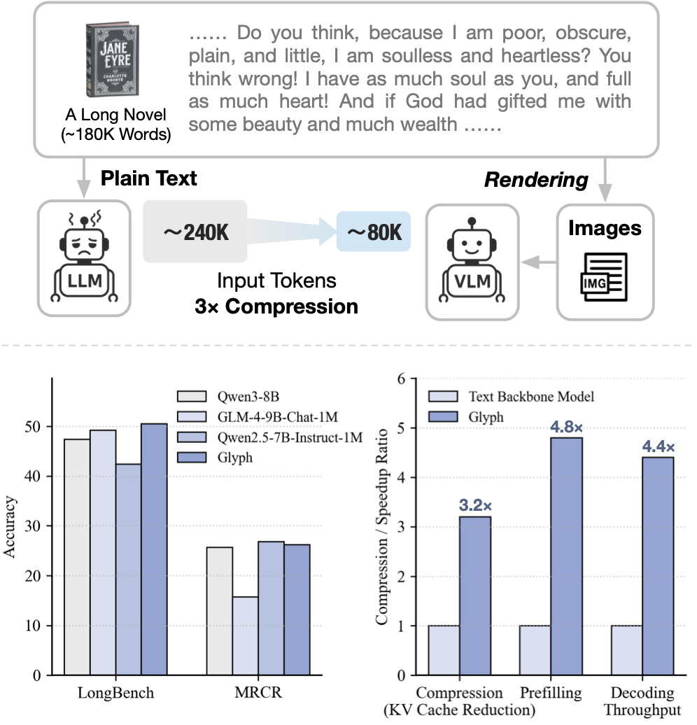 这让我想起不久前智谱的另一个工作Glyph:把文本渲染成图片,让视觉 token 承载更多信息。