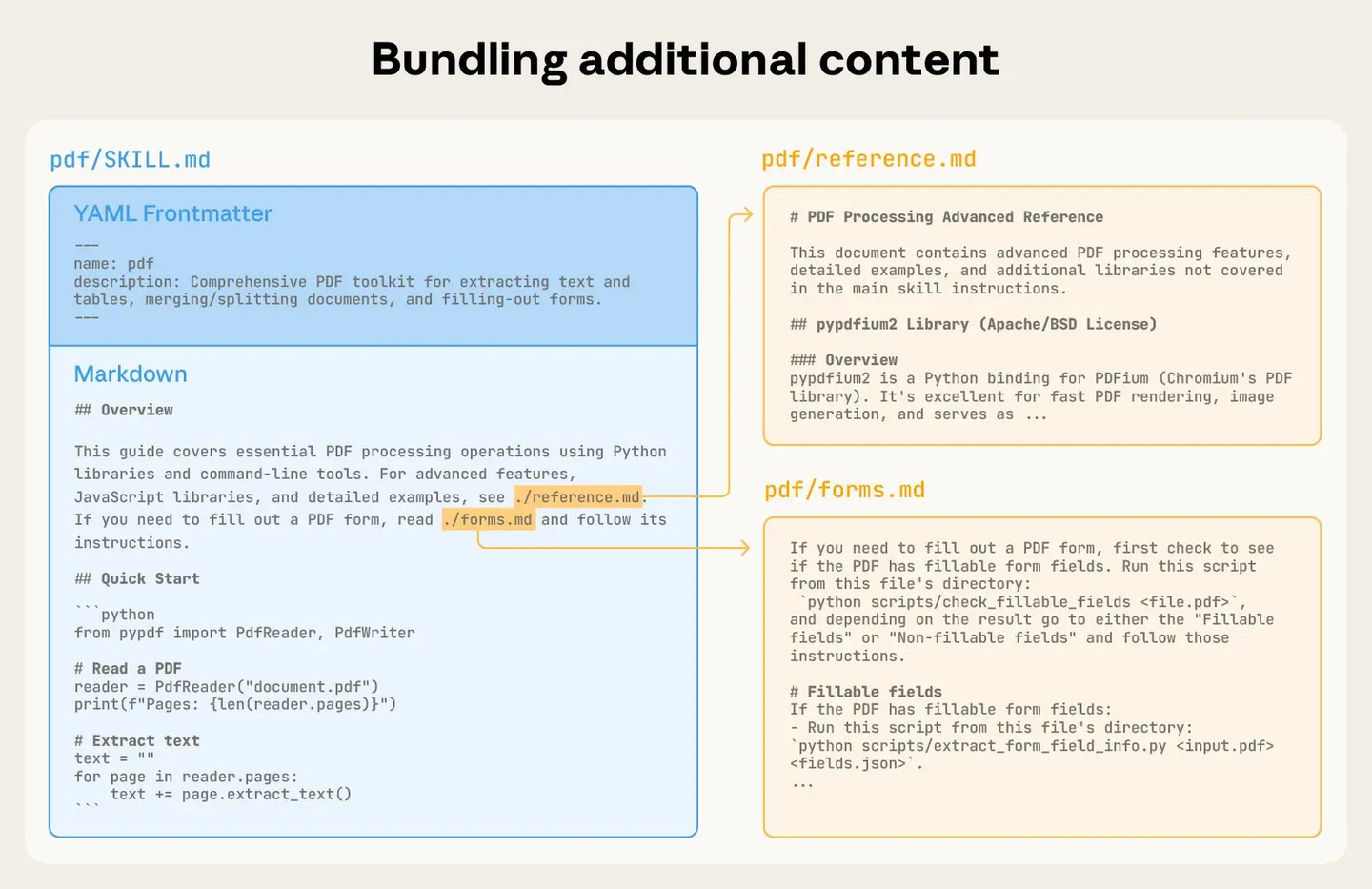 这里的上下文窗口也可以理解为AI调用每一层Skills的触发时机,这里我们沿用Anthropic举的让Claude填写PDF表单的例子。