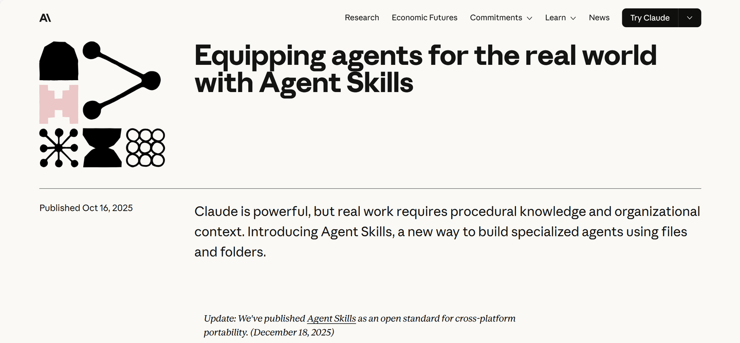 2025年10月16日,Anthropic 在一篇名为 Equipping agents for the real world with Agent Skills 的文章中正式提出Agent Skills概念。