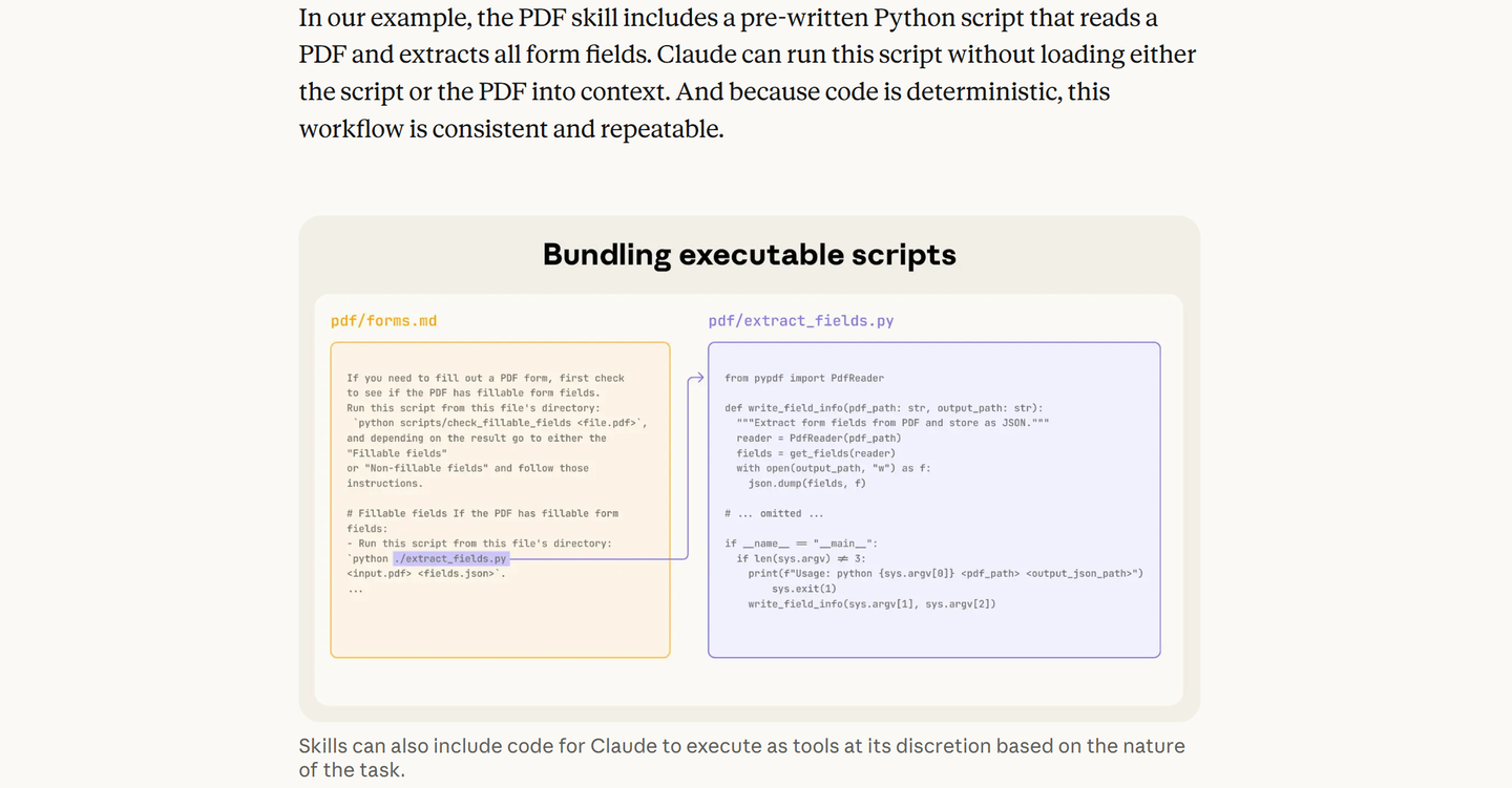 Skills 不仅可以是YAML和Markdown格式的文档,还可以包含提前写好的可执行代码。这一步极大地保证了 Skills 的稳定运行。