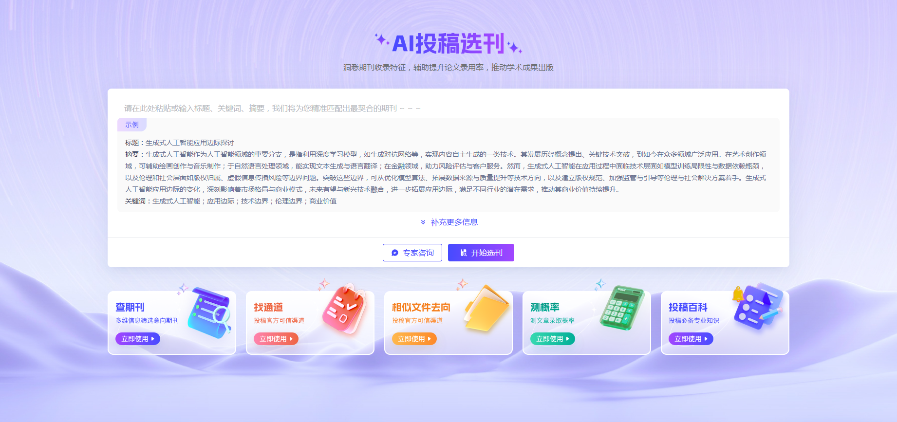 - 投稿智能推荐:输入论文摘要,推荐匹配期刊(含录用率、审稿周期、近期热点),并生成格式合规的投稿信。