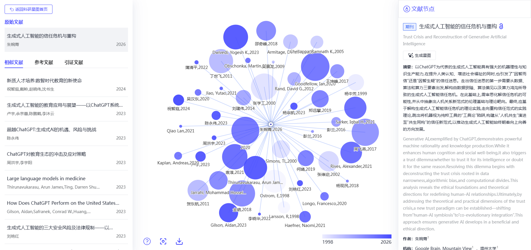 - 科研星图:输入文献DOI,可视化呈现该研究在领域中的位置、后续引用脉络、关键突破点,助力发现创新缺口。