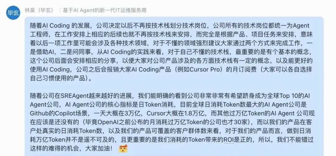 前阿里P10、大神毕玄(林昊)在飞书里发了个通知:
