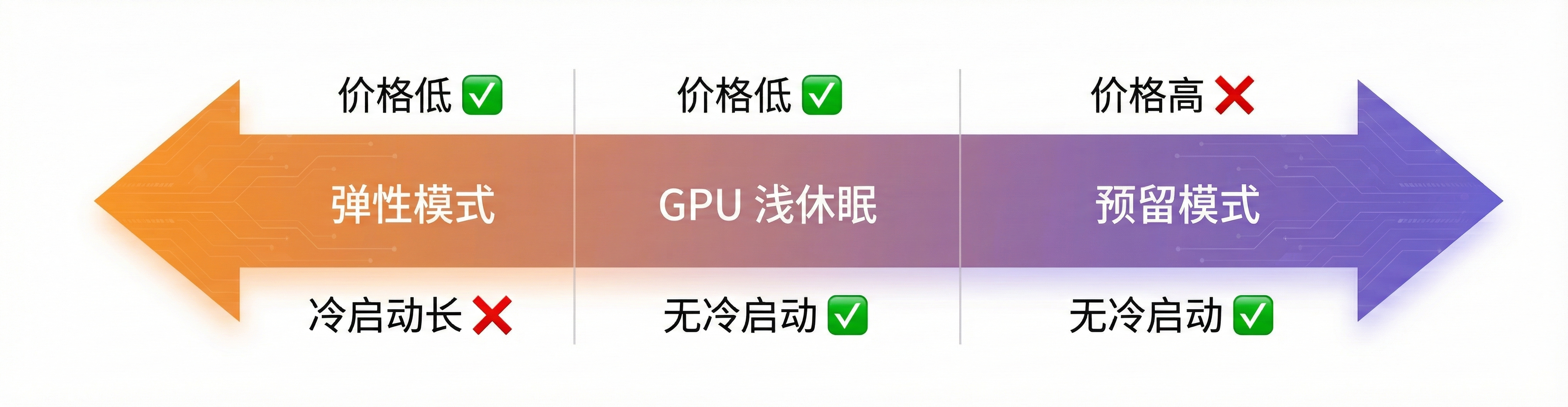 - 要速度(预留模式):为了毫秒级 - 秒级的响应,必须长期通过预留模式持有 GPU 实例,但昂贵的空置成本让人心痛。