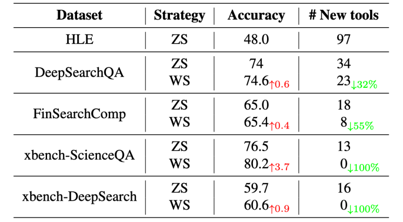 再看这张图更直观——两种策略下的Agent性能统计对比,ZS代表从零工具起手,WS代表前面说的按数据集顺序的知识迁移策略。