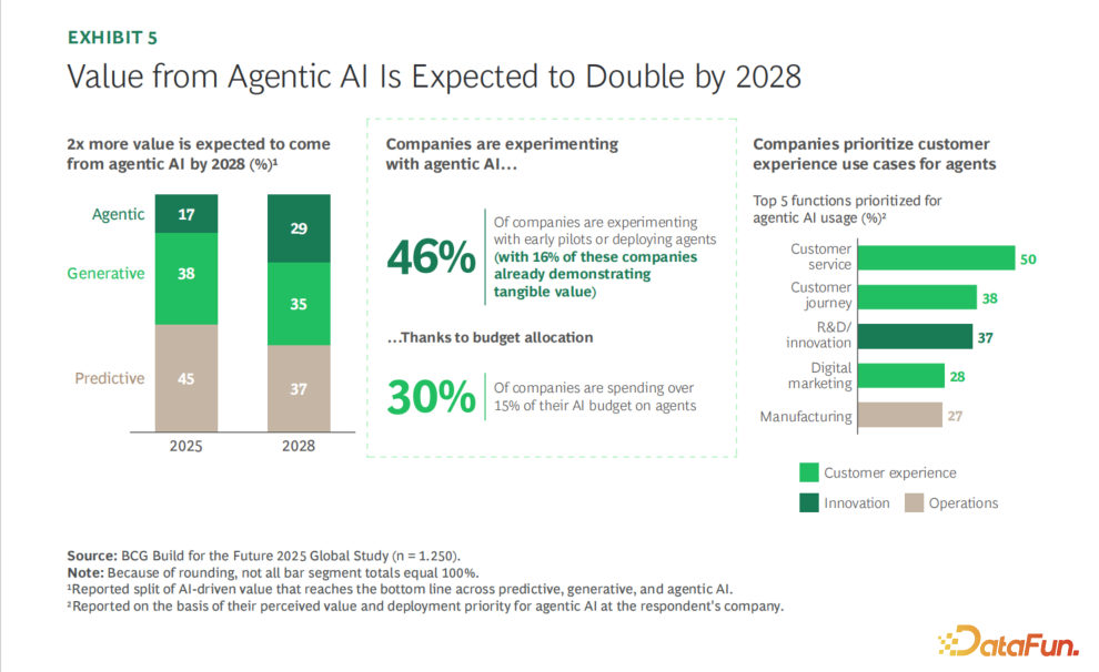 波士顿咨询的预测更激进:代理 AI 占 AI 总价值的比例将从 2025 年的 17% 飙升至 2028 年的 29%。在北美市场,这个比例预计会达到 51%。IBM 的数据也印证了这个趋势:2025 年有四分之一的高管让 AI 代理独立行动,到 2026 年底,这个比例将达到十分之七。