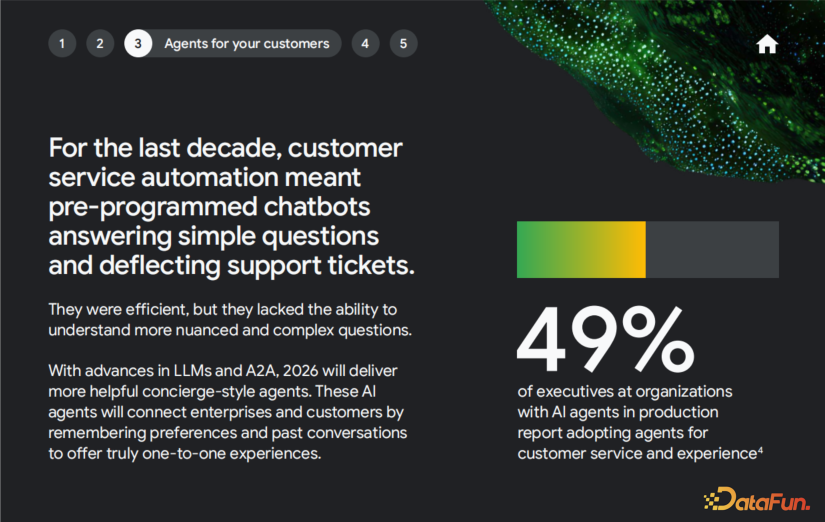谷歌云的报告分析了三个让这成为可能的技术突破:多模态理解(能看懂图片、理解风格偏好)、支付集成(直接调用支付 API 完成交易)、供应链打通(实时库存和物流数据接入)。客户服务类代理49%的部署率,营销类代理 46% 的部署率,这些都是购物旅程的关键环节。