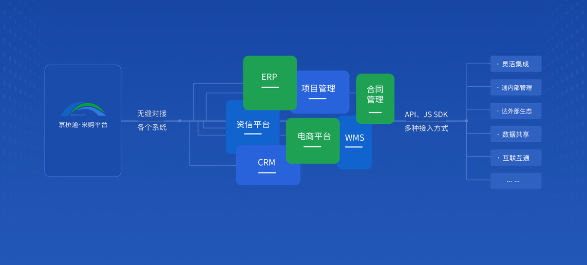 (4)平台集成能力:对接京东/苏宁等50+电商平台,实现比价采购一体化。集成ERP/CRM/OA/财务等系统,打通预算、库存、支付数据流。