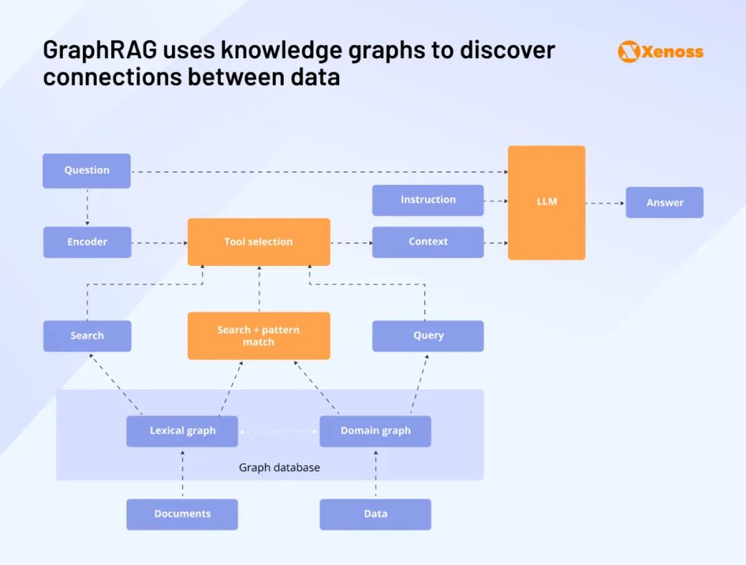 GraphRAG使LLM能够通过分析互连的数据关系检索数据集中未明确提及的信息,支持超越简单语义匹配的复杂推理和推理任务。