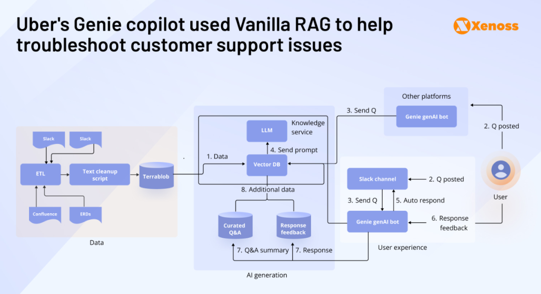 Uber的Genie副驾驶是管理客户支持运营的有效Vanilla RAG实施典范。系统遵循简化的四步工作流程:数据工程师抓取内部维基和Stack Overflow内容,将文档转换为向量嵌入,存储到数据库中,并通过Slack集成处理员工查询以获得实时响应。