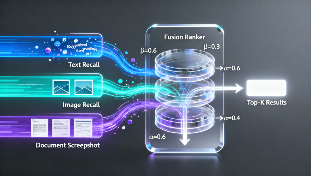 加权融合:对来自不同通道的得分进行归一化后,根据业务需求赋予不同权重(如图像通道权重0.6,文本通道权重0.4),再进行加权求和。这种方法允许系统显式控制各模态的重要性 20 。