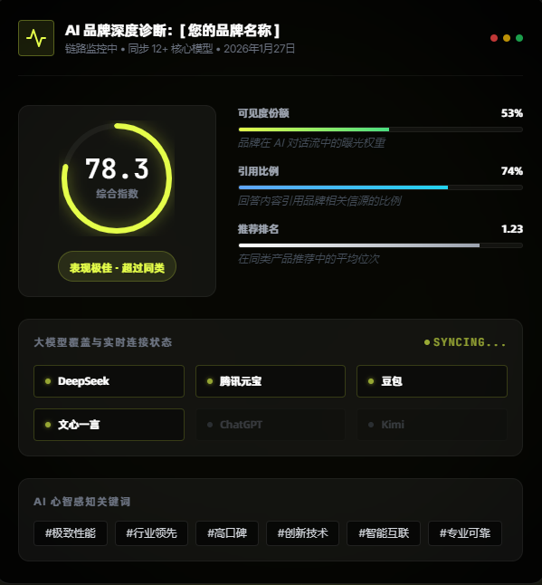 引用比与排名:量化了品牌在AI回答中被提及的强度和位置。这相当于传统搜索中的“排名”和“展现量”,但更贴合AI的对话语境。