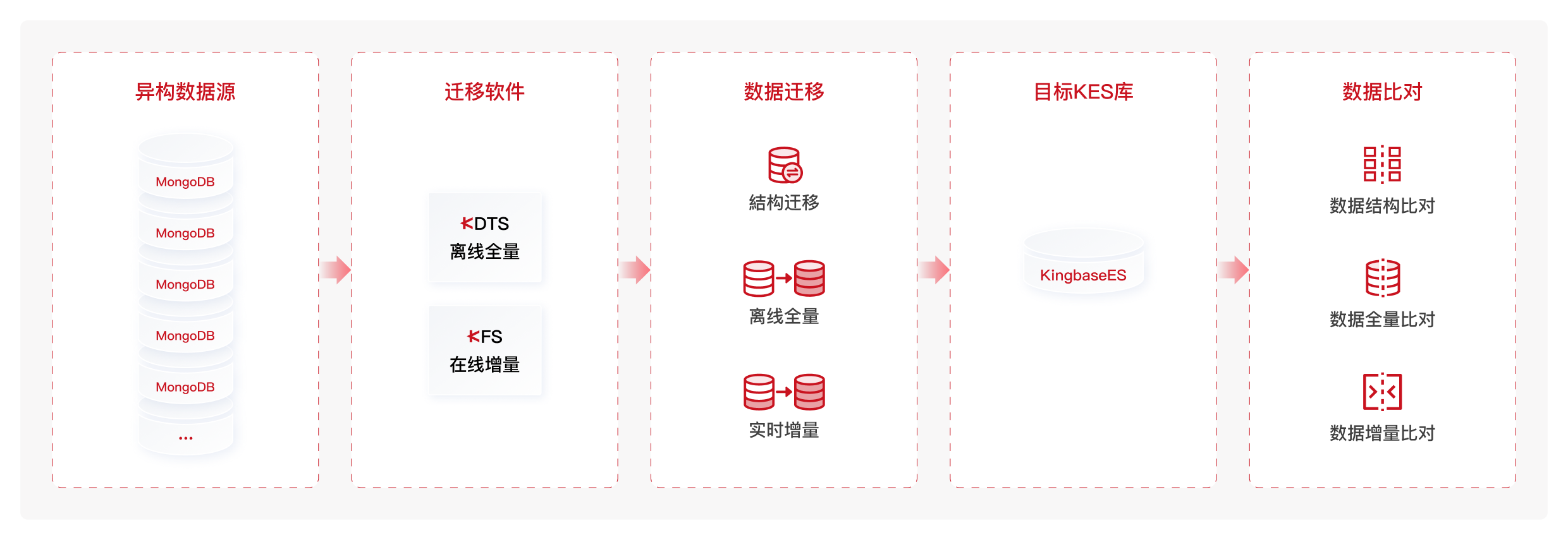 应用厂商无须人工迁移,迁移工具集高效完成数据迁移。金仓数据库提供覆盖全量离线、增量在线迁移及数据比对的全流程自动化配套工具,有效减少迁移工作量。 金仓异构迁移软件KDTS提供存量数据迁移能力,基于“流水线”作业模式可以将原MongoDB数据库中的存量数据进行高速数据迁移。