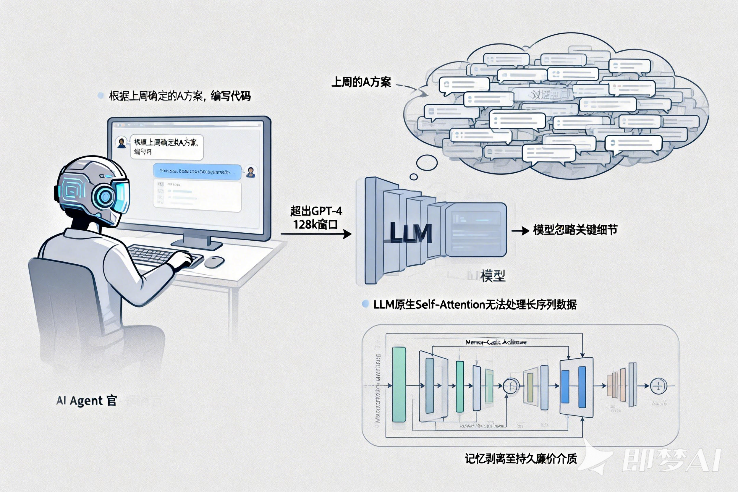 问题: “上周的 A 方案”淹没在数万条对话历史中,超出了 GPT-4 的 128k 窗口,或者即便塞进去,模型也忽略了关键细节。