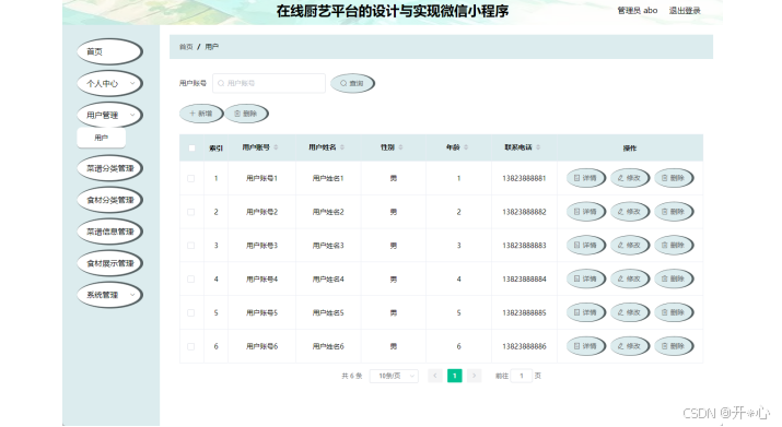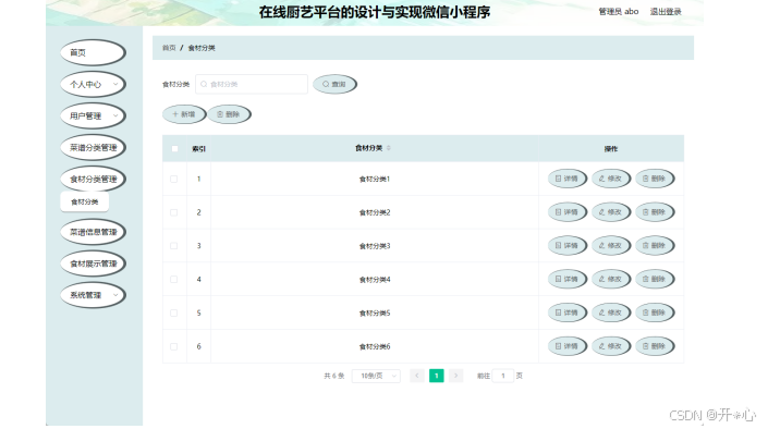 此页面显示食材分类信息,食材分类页面见下图。此页面主要让管理员对食材分类进行查询,添加,修改,删除操作。