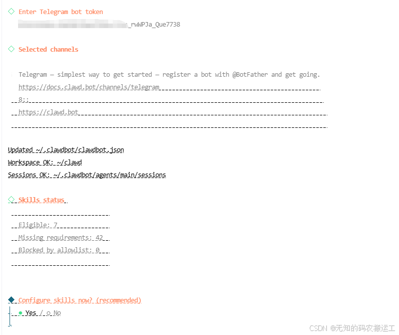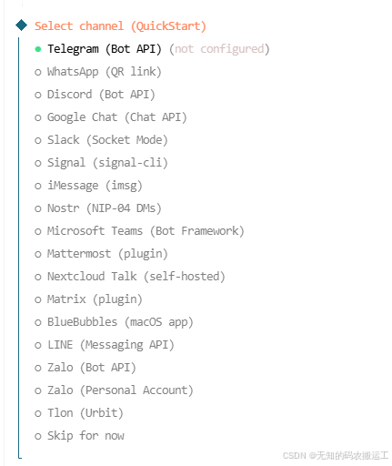 这里就是重点了,这也就是Clawdbot的重点之处,他是可以完整的对接一些海外的app的,那这里我就用Telegram的bot来测试一下吧