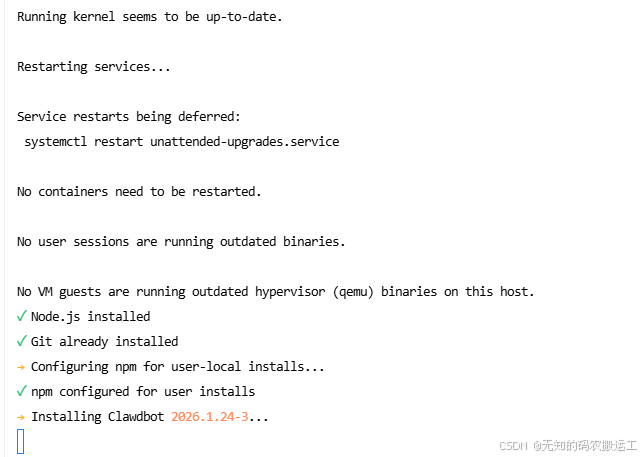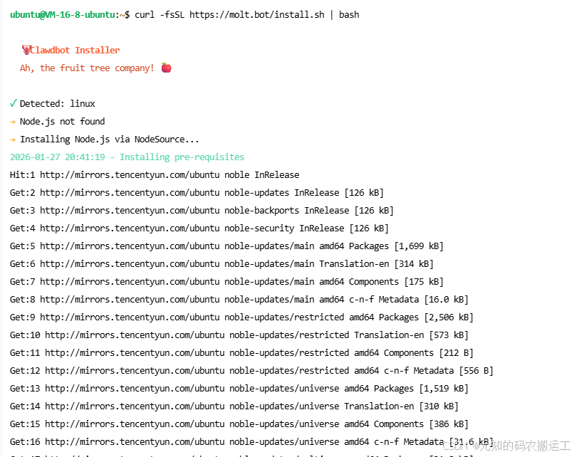 安装我们的Clawdbot,命令:curl -fsSL https://molt.bot/install.sh | bash 之后安静的等待就行