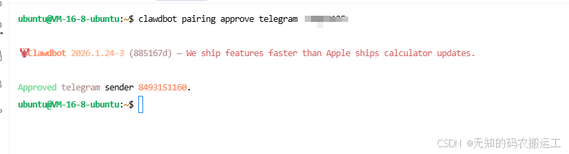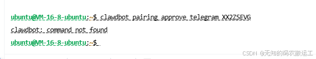 这里机器人说了机器人的所有者必须通过以下命令才可以授权,那这里我们就回到Clawdbot授权一下,命令是【clawdbot pairing approve telegram <code>】这里code替换成Pairing Code,然后我们回车命令,会发现出问题了