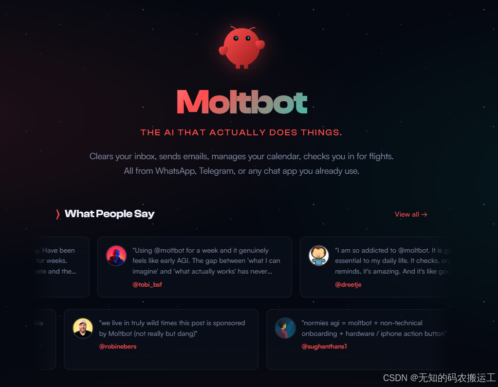 最近博主,也就是我,发现一个国外作者,【Peter Steinberger】在本月推出了一个新的智能体【Clawdbot】,首先我们可以先去官网看一下这个东西是什么:Clawdbot