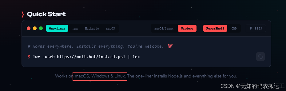 首先呢,看了一下这个文档,安装环境还是不错的,macOS/Linux、Windows【Powershell/CMD】