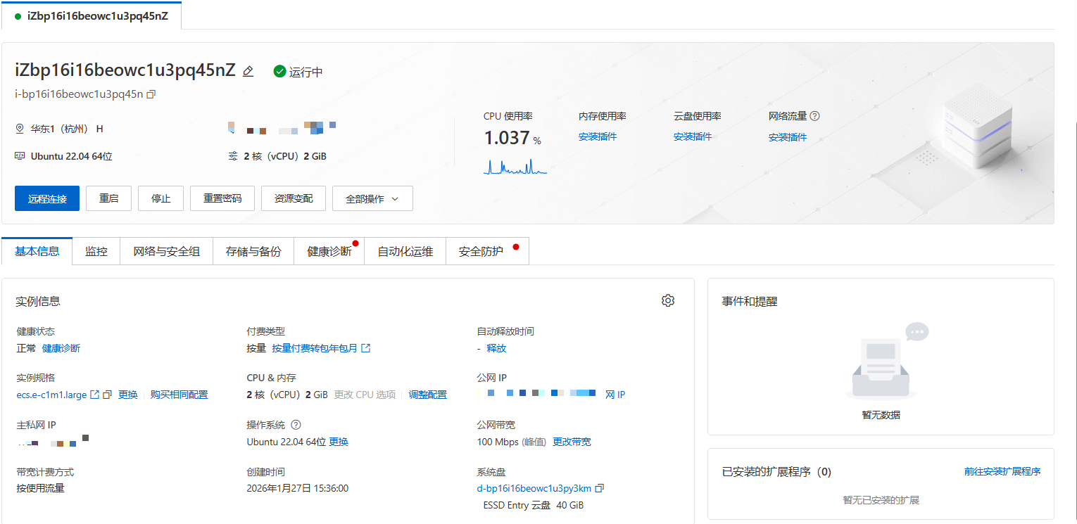 配置完成服务器后重置密码,开启远程连接,使用上面在线的或者其他ssh工具连接上述配置见面提供的公网ip