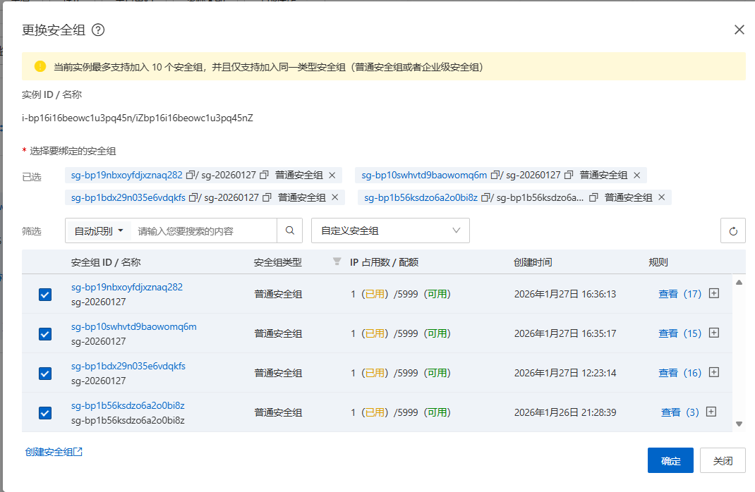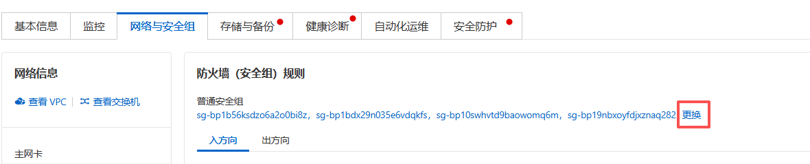 设置好安全组之后,在实例的网络与安全组中,选择更换,勾选创建的安全组,确定