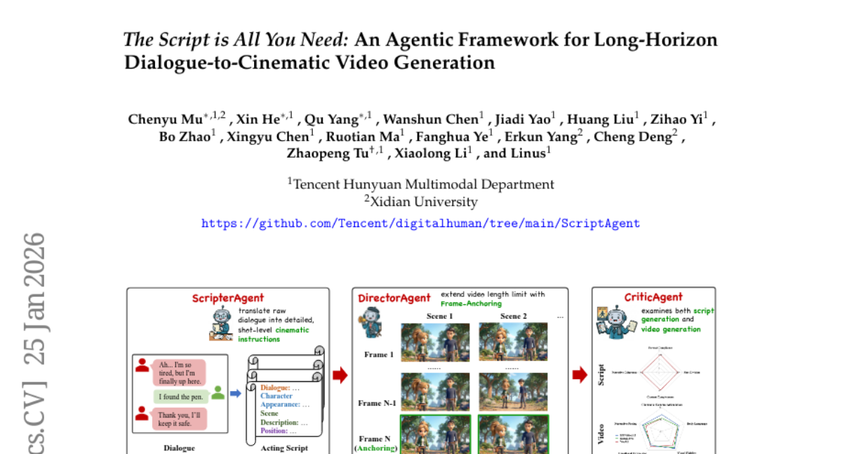 当你看到一部电影时,是否想过从剧本到银幕需要经历多少复杂的工作?导演需要将文字转换为视觉画面,摄影师要选择合适的镜头角度,演员要演绎角色情感,剪辑师要确保画面流畅连贯。现在,腾讯混元多模态团队与西安电子科技大学合作的最新研究,首次实现了从对话到完整电影的全自动化制作流程。这项研究于2026年1月发表在计算机视觉顶级会议上,论文编号为arXiv:2601.17737v1,有兴趣深入了解的读者可以通过该编号查询完整论文。