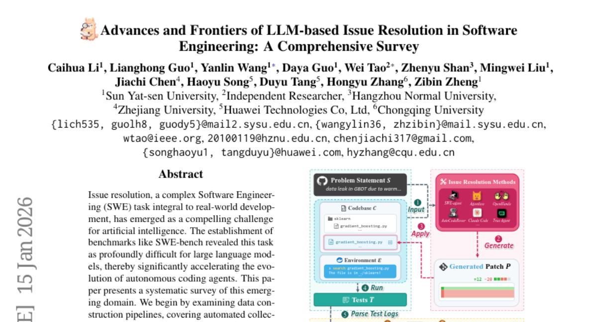 这项由中山大学联合华为技术有限公司、重庆大学、浙江大学等九所知名高校和企业共同完成的研究发表于2025年1月,论文编号arXiv:2601.11655v1。研究团队深入调研了175篇相关论文和在线资源,首次系统性地梳理了基于大语言模型的软件问题解决领域的发展现状。