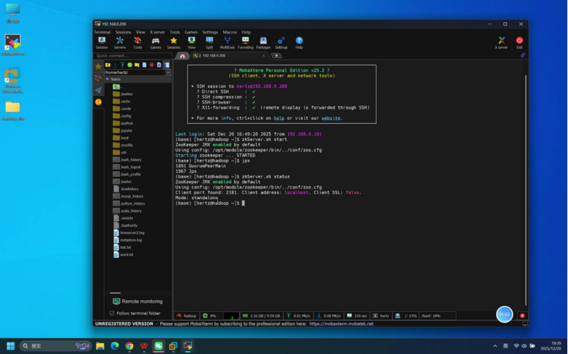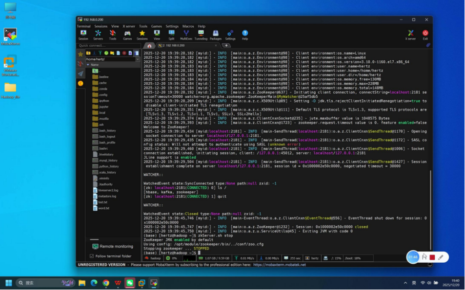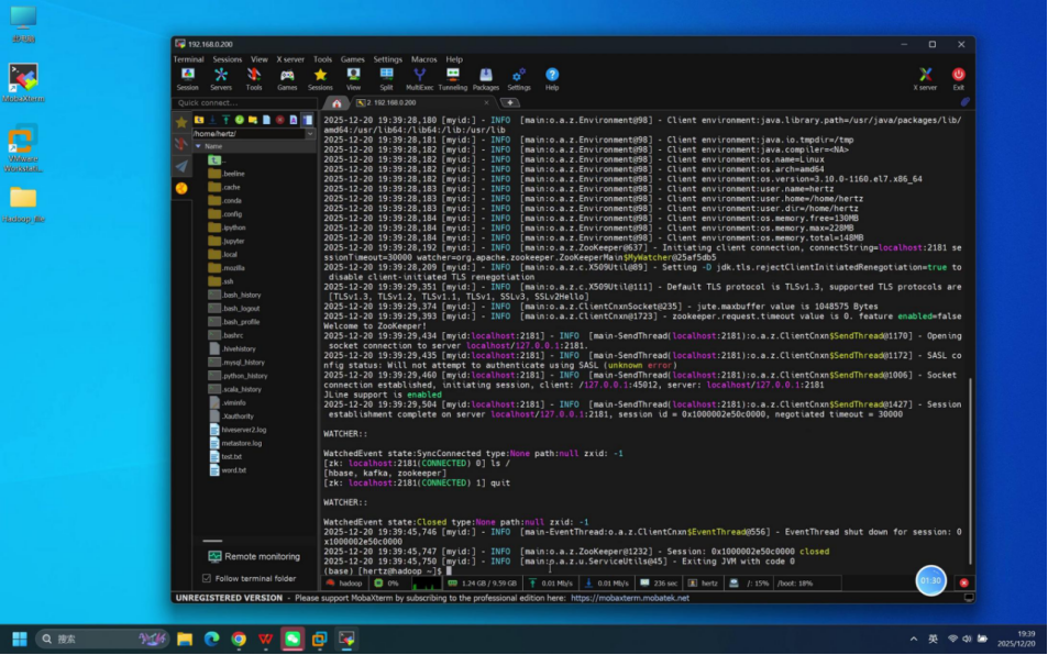 本文介绍伪分布式环境下ZooKeeper组件的独立测试流程。测试基于1台hadoop虚拟机,使用hertz账号(密码hertz)通过Mobaxterm工具远程连接。测试步骤包括:确认虚拟机状态、建立SSH连接、启动ZooKeeper服务(zkServer.sh start)、验证进程(jps命令显示QuorumPeerMain)、检查服务状态(zkServer.sh status显示standal