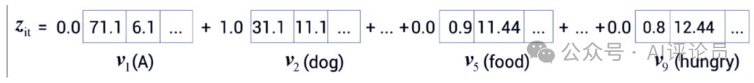 句子中的代词 it 可能代表句子里的名词 food 或者 dog,虽然我们人类非常容易理解,但是计算机不可能像我们那样去理解,它也没法像我们一样去理解。计算机是通过自注意力机制来处理代词 it 具体指代的内容是什么(food 或 dog)。
