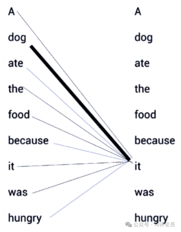 通过上图,我们就可以看出,it 与 dog 的相关性更高一些,通过比较粗重的线条来表示。那么,怎么能够确定 dog 和 it 之前的相关性更高呢?