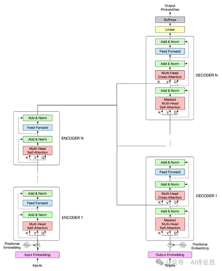由上图可见,Transformer 由 Encoder 和 Decoder 两部分组成,首先是 Encoder 部分,输入 Embedding 数据经过一些处理后(Embedding输入、位置编码)进入到 N 个 Encoder 中,N 个 Encoder 最终输出特征值数据,结果作为每个 Decoder 中的 Multi-Head Cross-Attention 层的输入;然后是 Decoder 部分,输出 Embedding 数据经过一些处理后(Embedding输入、位置编码)进入到 N 个 Decoder 中,经过 N 个 Decoder 层的处理后,后面还要依次经过 Linear 层、Softmax 层处理后,得到最终的目标输出的预测概率结果。