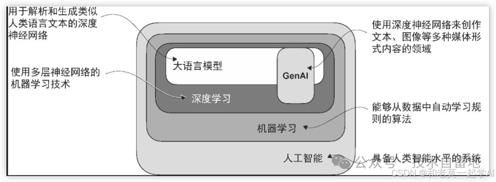 由于大语言模型能够生成文本,因此它们通常也被归类为生成式人工智能(generative artificial intelligence,简称 generative AI 或GenAI)。