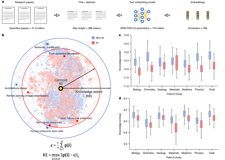 然而,当视角从个体切换到整个学科时,趋势发生了逆转。研究者通过将论文嵌入高维知识空间,并测量其覆盖的“知识范围直径”发现:
