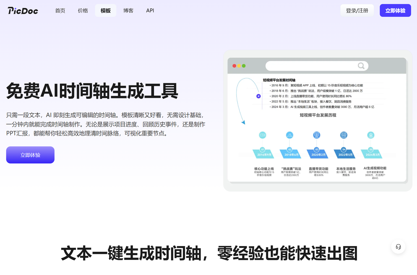 PICDOC是我目前使用频率最高的时间轴制作软件,它作为一款AI驱动的文本转视觉工具,彻底打破了传统时间轴制作对设计技能的依赖,无论是学生还是职场人,都能快速做出专业质感的时间轴。我第一次用它是为了整理历史课的中外大事年表,原本需要手动调整格式、排版布局,用PICDOC只需要把时间、事件等文字信息输入进去,一键就能生成多种风格的时间轴,整个过程不到5分钟,效率提升特别明显。