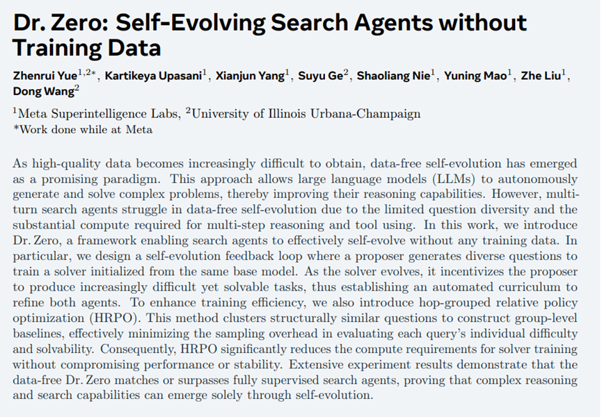 Meta超级智能实验室和伊利诺伊大学的研究人员联合开源了一个重磅AI智能体模型Dr.Zero。