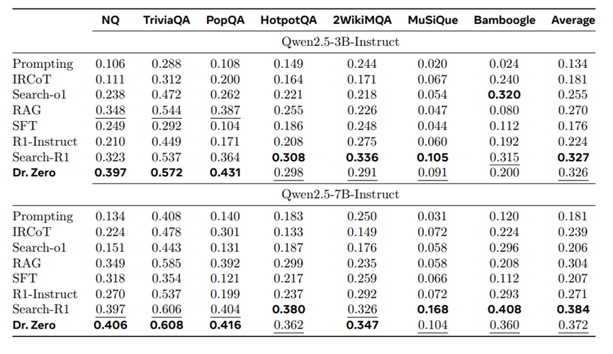 为了测试Dr.Zero的性能,研究人员使用了Qwen2.5-3B和7B两个版本进行测试,不管哪个版本,Dr.Zero的表现都很能打。