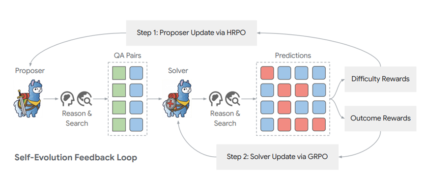 它们俩的优化是交替进行的:提议者先出一批题,求解器做完之后,把结果反馈给提议者,提议者根据反馈优化自己的出题思路;而提议者出的这些高质量题目,又成了求解器的训练素材,让求解器继续提升。