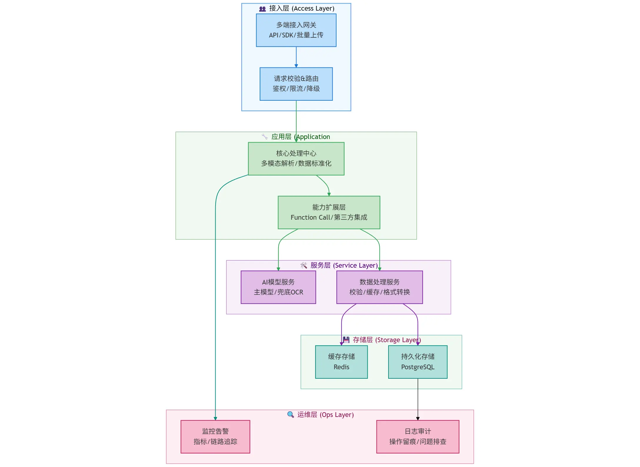 - 存储层:按数据特性分两类存储:缓存存储(Redis)存高频访问的发票信息,提升查询效率 + 持久化存储(PostgreSQL)存全量发票数据,做长期归档。