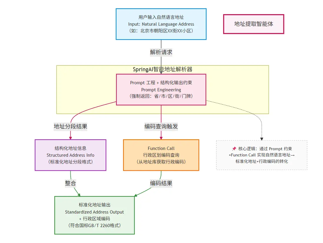虽然价格不贵,但总归也是收费不是;这个场景非常垂直聚焦,正好也可以作为我们应用集成LLM的一个实验田。接下来我将介绍下如何利用 Spring AI 框架结合大模型能力,实现从自然语言文本中自动提取结构化地址信息的完整方案,并且通过function call实时查询行政编码,从而打造一个完整可直接商用的 “地址提取智能体”