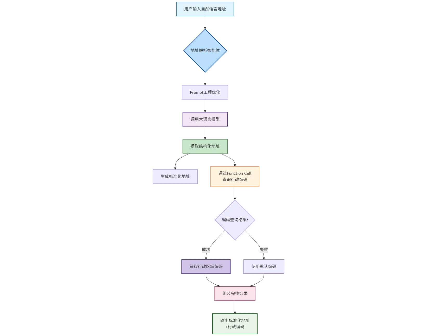 从整体的视角来看,这个地址信息的提取结构相对清晰,基于用户输入的自然语言、通过LLM获取结构化的地址信息,然后返回给用户;