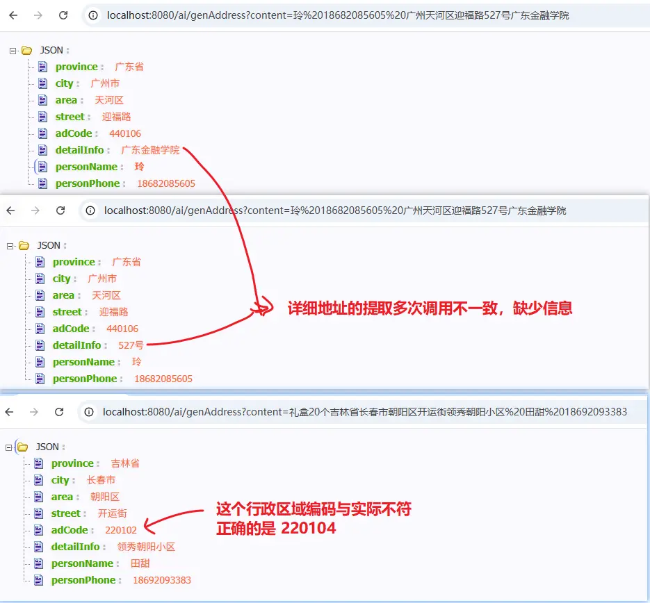 在实际的生产体验过程中,我们大概率会发现,同样一段自然语言,大模型提取的详细地址这块,可能并不总是相同的,why?