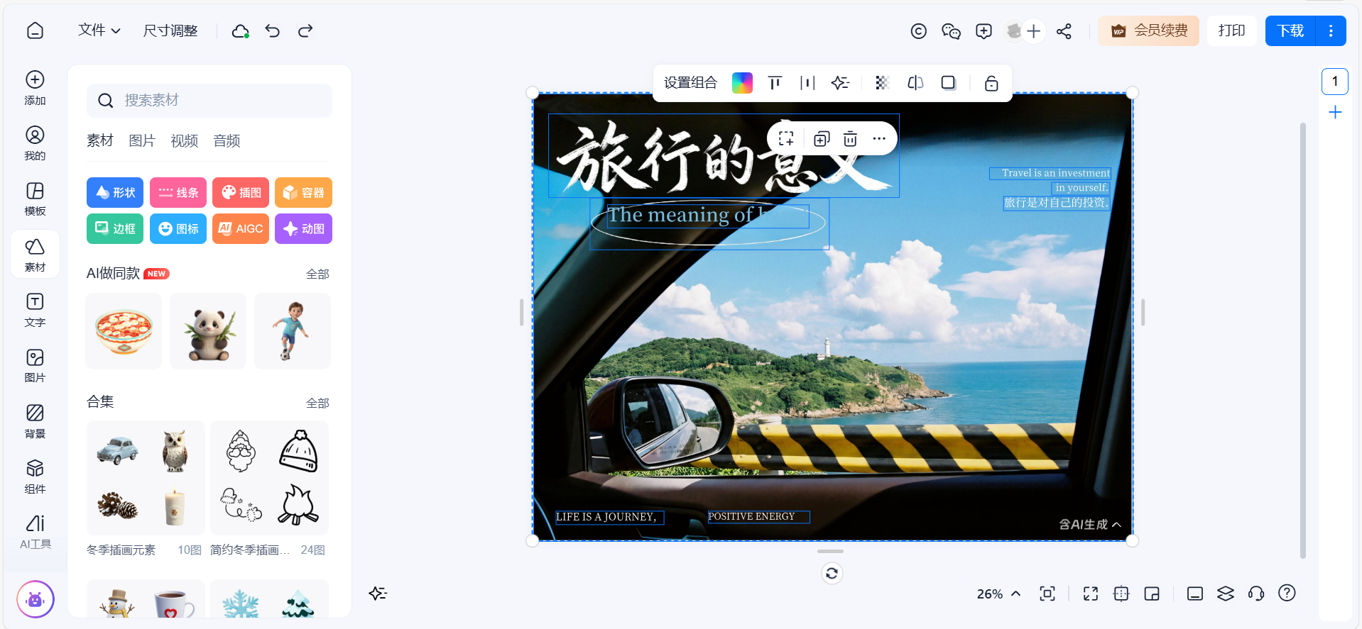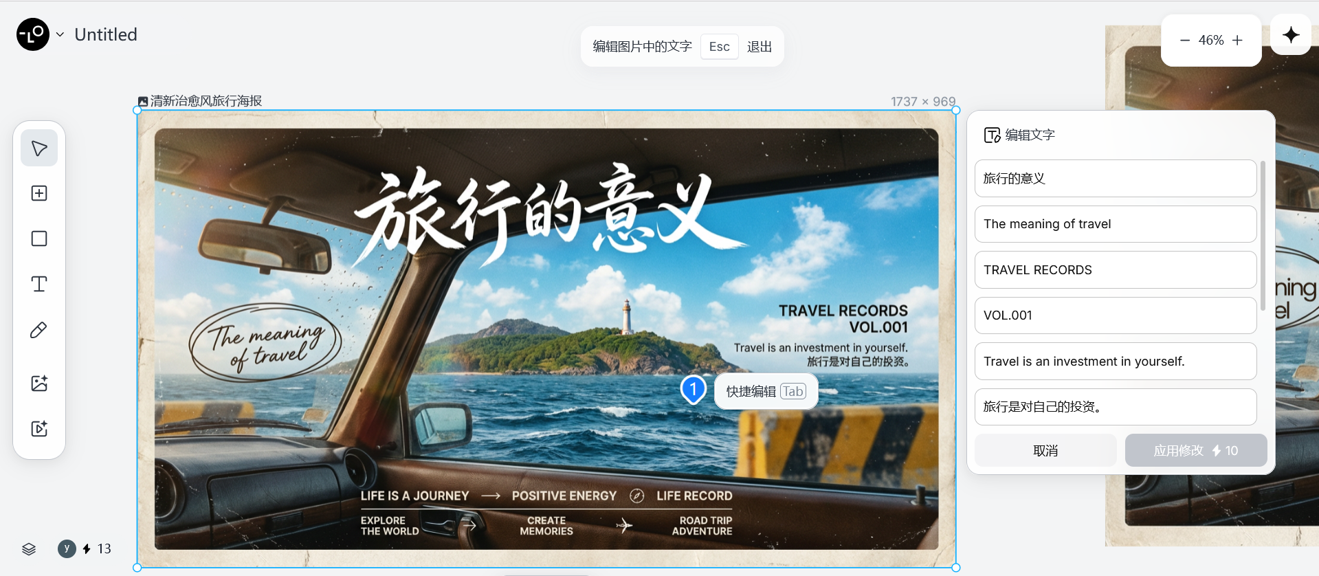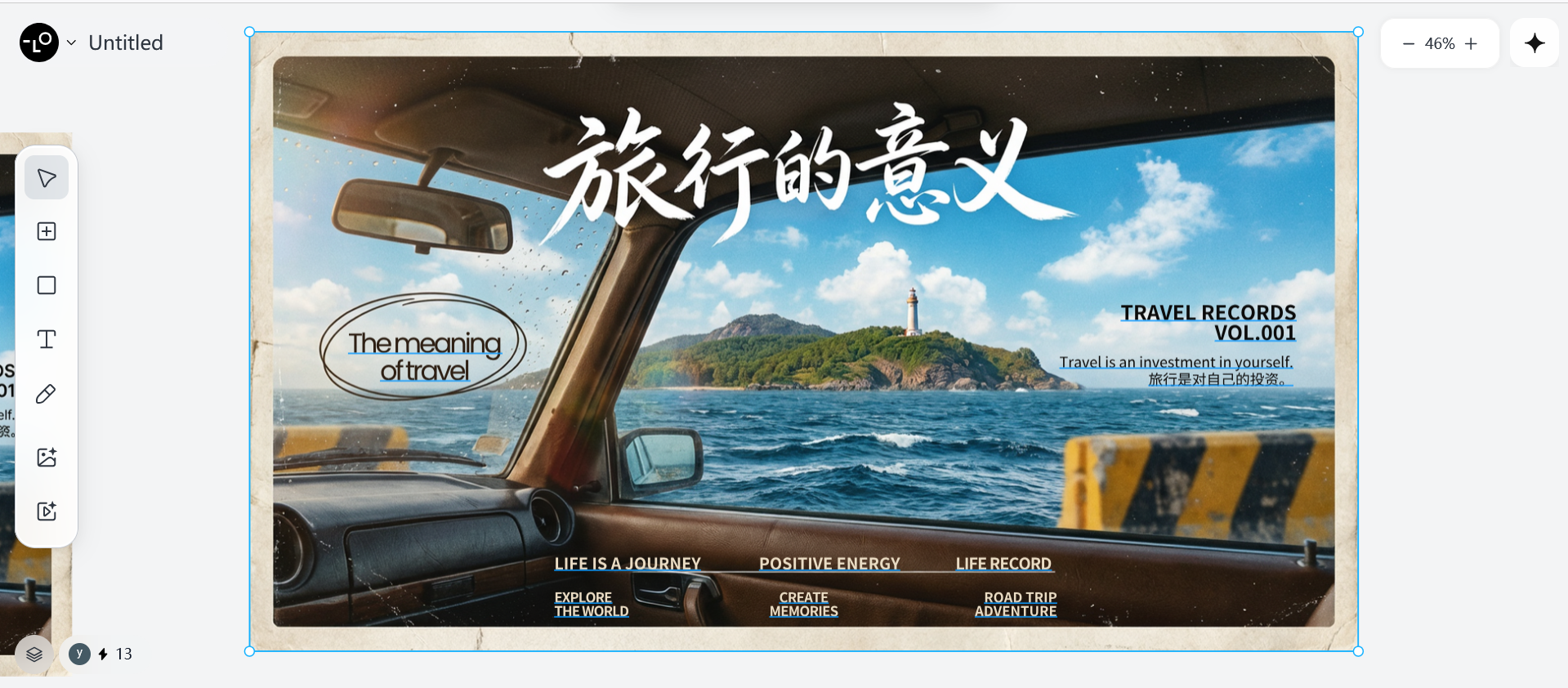 - 精确性:文字的分离很精准,把所有图层选中之后可以看到,所有文字是都可以编辑的,而且不会改变原字体,这一点比lovart强,但是图片元素也没办法修改。