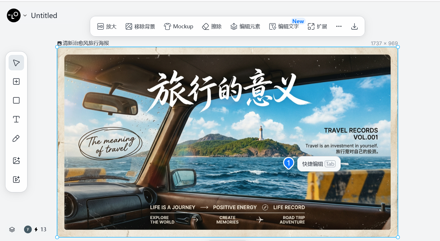 - 便捷性:一般,它直接生成的结果还是一张图片,没有图文分层,如果想要编辑其中的元素,你需要点击“编辑元素”,然后它又会花两分钟的时间生成图文分层的结果,如果你想只修改文字,要点击“编辑文字”,然后它会只识别文字供你编辑。