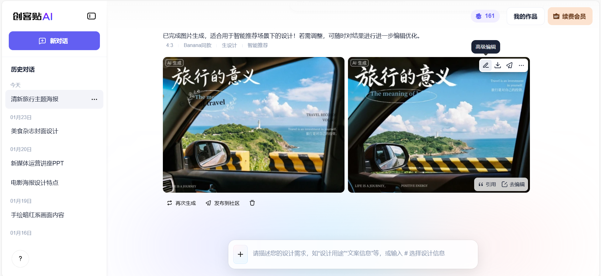 - 便捷性:较好,生成后的图片点击一下就能继续编辑,不用等待。